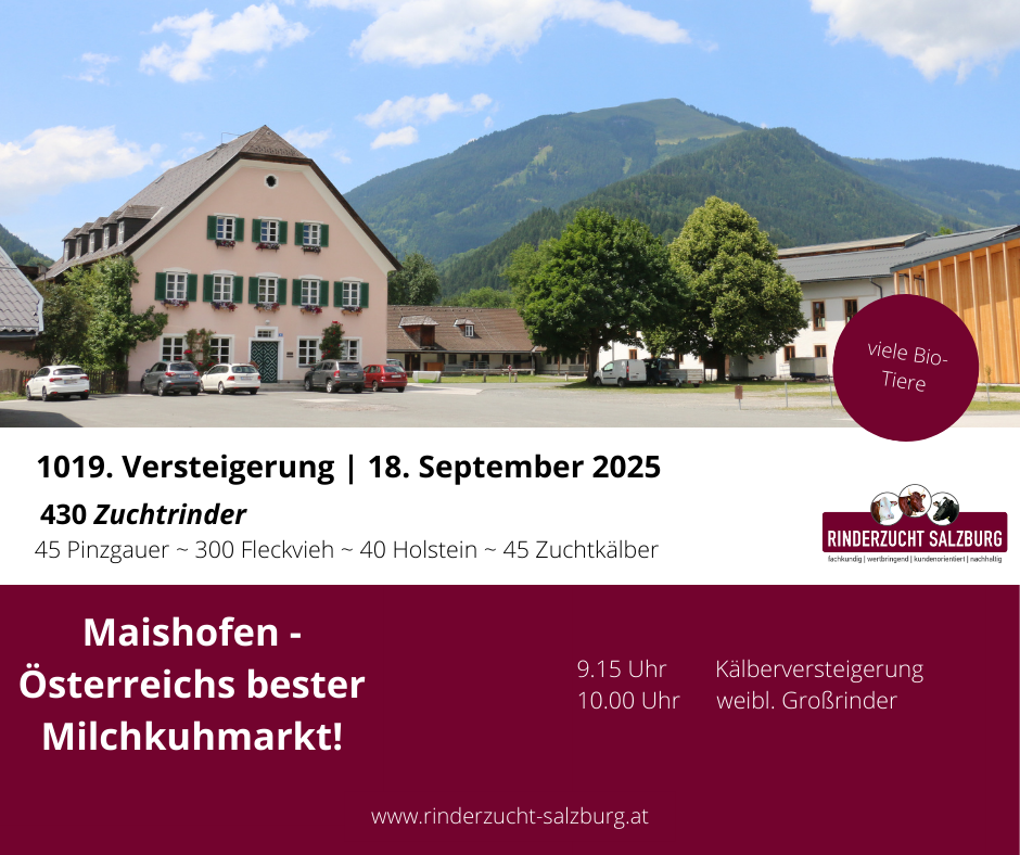 Home » News » 1019. Versteigerung in Maishofen 1019. Versteigerung in Maishofen 18.09.2025 – 40 Holsteintiere 09:15 Uhr – Kälberversteigerung 10:00 Uhr – Großrinderversteigerung zurück zu Übersicht