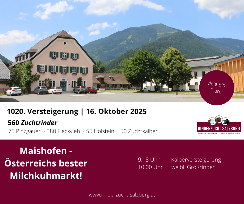 Home » News » 1020. Versteigerung in Maishofen 1020. Versteigerung in Maishofen 16.10.2025 – 55 Holsteintiere 09:15 Uhr – Kälberversteigerung 10:00 Uhr – Großrinderversteigerung zurück zu Übersicht